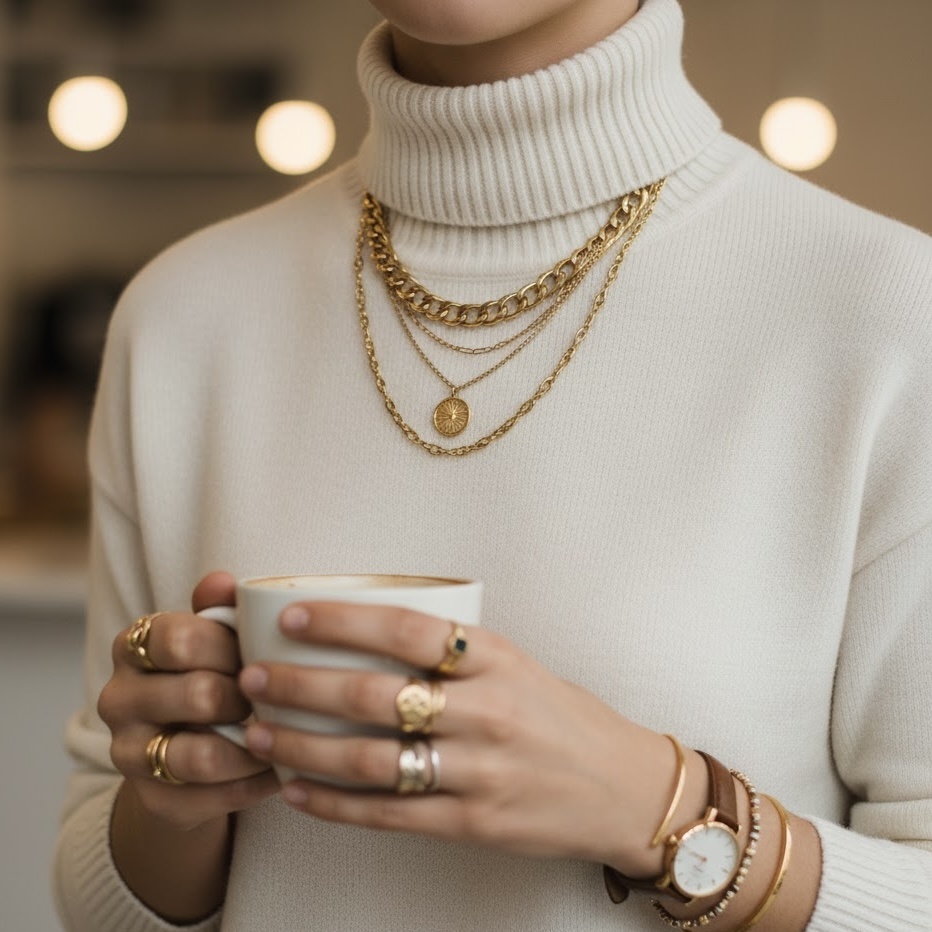 Украшения — это самый простой способ добавить глубину. Ты можешь надеть простую однотонную водолазку (да, ту самую, которая есть у всех). Но если дополнить ее многослойным комплектом изящных цепей или крупным браслетом-манжетой, образ моментально выглядит продуманно и дорого.
