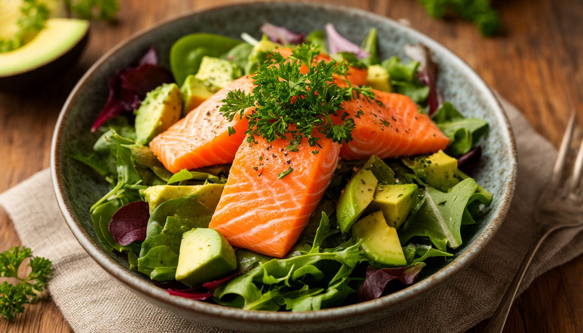 Это не просто салат — это лёгкое дыхание Средиземноморья на вашей тарелке: полезный, сытный и невероятно вкусный. Идеален для обеда, ужина или изысканного перекуса, когда хочется чего-то лёгкого, но утончённого. Для заправки: 1. Обжарка или запекание лосося: Разогрейте сковороду с антипригарным покрытием с 1 чайной ложкой оливкового масла. Посолите и поперчите филе лосося. Обжарьте лосося по 3–4 минуты с каждой стороны или запеките в духовке при температуре 190°C около 12–15 минут. Дайте немного остыть и нарежьте крупными кусочками или разберите вилкой. Совет: Вы можете использовать слабосолёного или копчёного лосося, если предпочитаете холодный вариант салата. 2. Подготовка овощей: Очистите авокадо и нарежьте его кубиками или ломтиками. Нарежьте огурец кружочками или полукружками. Разрежьте помидоры черри пополам. Промойте и обсушите зелень. 3. Приготовление заправки: В миске смешайте оливковое масло, лимонный сок, горчицу, мёд, соль и перец. Взбейте вилкой или венчиком до образования