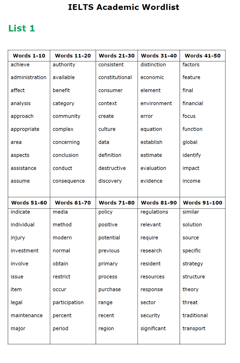 On this page you can find an ultimate IELTS academic wordlist that consists of 5 sub-lists with 100 words in each. The lists get increasingly difficult. By learning these words you will learn the most common and important vocabulary that occurs in IELTS.