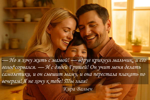 — Но я хочу жить с мамой! — вдруг крикнул мальчик, и его голос сорвался. — И с дядей Гришей! Он учит меня делать самолетики, и он смешит маму, и она перестала плакать по вечерам! Я не хочу к тебе! Ты злая!