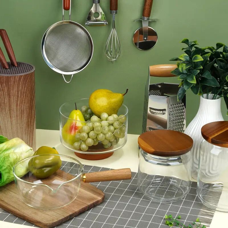 Стеклянная кружка с деревянной ручкой конечно же впечатлила. Легкая, удобная и красивая. Объем 450 мл. Салатник на деревянной ножке - лучший предмет в коллекции. Классно смотрится. Может послужить и вазой для фруктов. Объем 1,8 л. Все изделия в коллекции выполнены из боросиликатного (прочного) стекла.