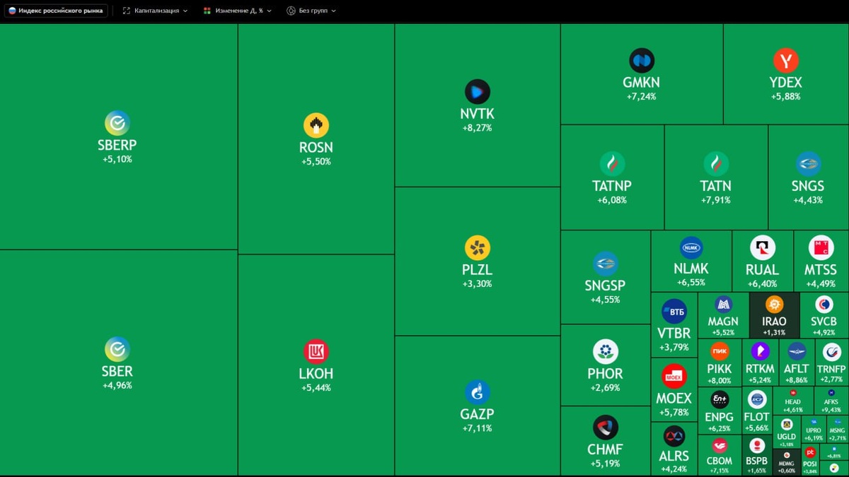 В ответ на пост Большую часть роста сделали за 1 день. Индекс на текущий момент показывает рост на 6%, что является лучшим днем в этом году (если не откатится. С праздником! 🍬🍬🍬