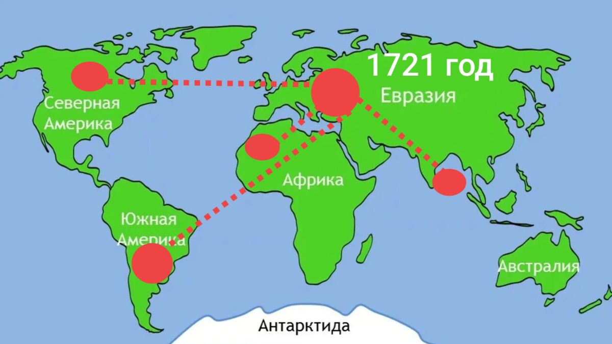 Здравствуй, дорогая Русская Цивилизация. 1721 год. Россия празднует победу в тяжелейшей войне со Швецией. Вот-вот в Петербурге Сенат и Синод объявят Россию Империей. Но что в этот момент происходит в мире? Например США находятся под британским влиянием. Они колония, причём с территорией не в таком виде, как мы их знаем сегодня. А вот в таком: Территория всего 2 миллиона квадратных километров. Размером примерно с Алжир или Конго. Самым примечательным событием в США в том году стала эпидемия оспы. В Бостонскую гавань зашёл корабль "Морской конёк". Экипаж был заражён. В результате половина города заболела, за первые два месяца умерло почти 1000 человек. Министр Коттон Мазер и главный врач Забдиэль Бойлстон начали массовую вакцинацию. Дело в том, что на тот момент в колониях вообще не вакцинировали людей. Только в метрополии и то, исключительно богатых. Это, кстати, не первая вспышка. Бостон сильно пострадал от оспы в 1690 и 1702. Недалеко от США в той же Северной Америке была разбит