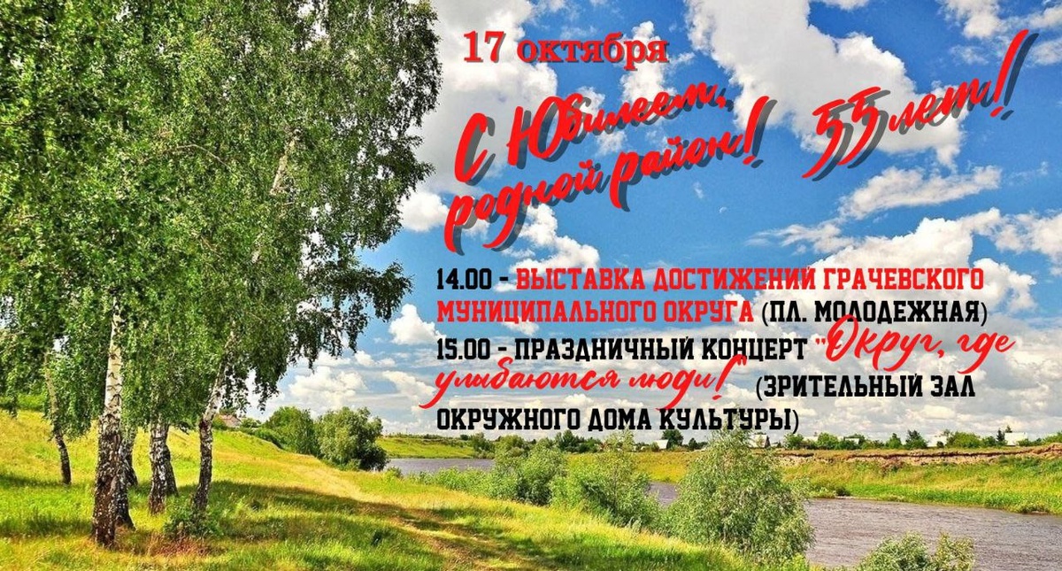 Жители Грачёвского района (округа) смогут отметить 55-летие малой родины вместе, участвуя в праздничных мероприятиях. Празднование начнётся в 14:00 17 октября 2025 года на площади Молодёжной в Грачёвке. Администрация округа приглашает всех желающих принять участие в торжестве, которое организуют наши культработники. В программе мероприятия концерт, викторины и многое другое.