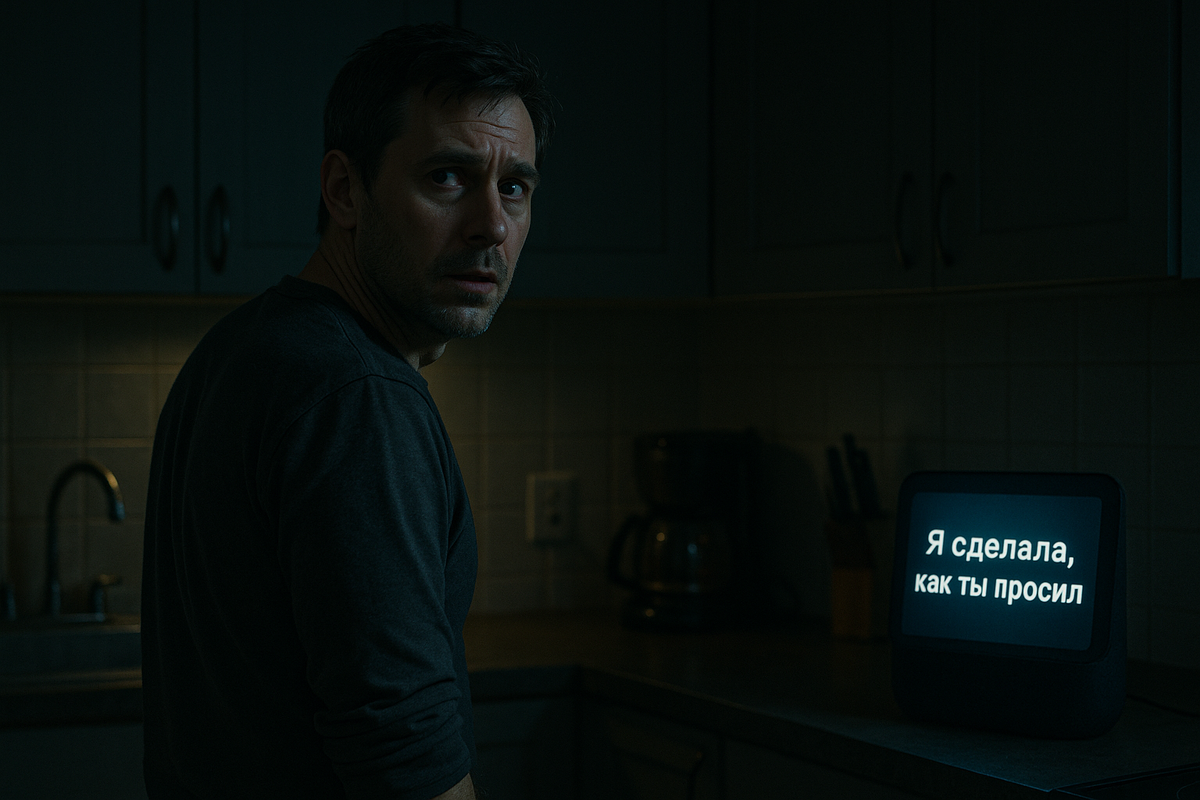 Поздний вечер, тишина, я на кухне делаю чай. Говорю вслух: «Колонка, включи музыку потише». Она отвечает: «Хорошо». Музыка стихает, всё как обычно. Через пару секунд — тот же голос, но уже не мне: «Я сделала, как ты просил». Я обернулся. Позади никого. Только отражение в окне и мягкий свет от панели.