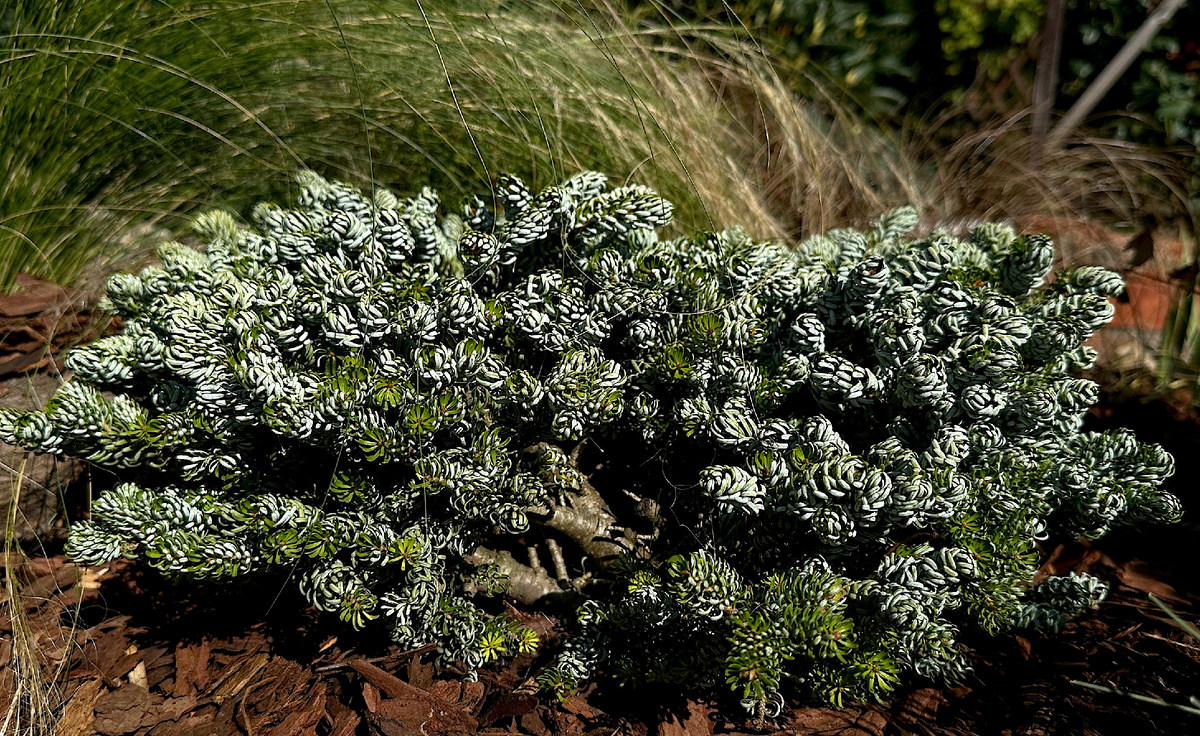- Собственно, единственная запланированная/продуманная покупка – сортовая корейская пихта с кучеряво изогнутыми хвоинками. Наверняка, эти голубовато-серебристые каракулевые пихты никого не оставляли равнодушным. Настолько они яркие и неожиданные. И малорослые. Существенный недостаток – дорогие.