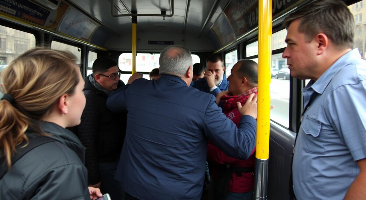 Эпицентр конфликта — средняя площадка. Мужчина, как говорят очевидцы, отказывается проходить дальше, перекрывает проход, «цепляется» к людям, которые просятся выйти. «Не толкайтесь!» — кричит пенсионер. В ответ, по словам пассажиров, незнакомец резко отдёргивает локоть, задевает пожилого мужчину плечом. Кто-то нажимает кнопку экстренного вызова водителя, салон наполняется нервными репликами. Водитель останавливает автобус у следующего павильона, по рации сообщает диспетчеру: «Конфликт в салоне, вызывайте экипаж». Кондуктор просит сохранять спокойствие, но градус напряжения растёт: слышны крепкие выражения, кто-то снимает на телефон, кто-то пытается пристыдить агрессора, кто-то отводит детей в сторону.