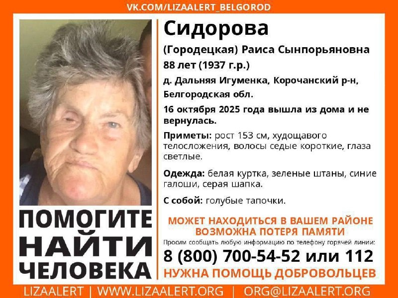 Пропал человек! Сидорова (Городецкая) Раиса Сынпорьяновна, 88 лет. С. Дальняя Игуменка, Корочанский район. 16 октября 2025 года вышла из дома и не вернулась. Если вы обладаете какой-либо информацией о пропавшей, просьба позвонить по номеру телефона горячей линии отряда 88007005452 (бесплатно по РФ) или 112. ❕ Жесть Белгород - подписаться 📸 Прислать новость: @predlozhka_zhest_bg