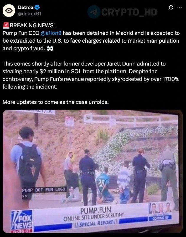 #слухи #pump ☹️ В Twitter распространяются слухи о задержании сооснователя Pump․Fun. Алона Коэна (Alon Cohen) якобы арестовали в Мадриде и должны экстрадировать в США для предъявления обвинений в рыночных махинациях и мошенничестве с криптовалютой. Сryptо Headlines