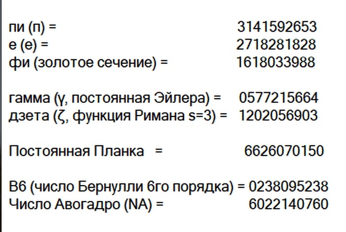 е (e) = 2718281828 фи (золотое сечение) = 1618033988