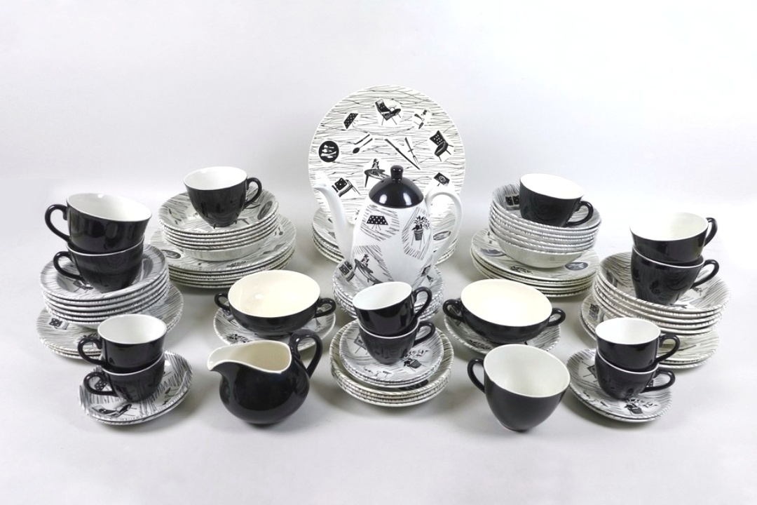 Давненько мы с вами не путешествовали, друзья! 😉 Знакомьтесь, Энид Сини. Энид родилась 2 июня 1931 года. И уже к окончанию школы точно знала кем будет - художником-керамистом. Она училась в Бурслемской школе искусств, где осваивала навыки росписи и золочения керамики. А после окончания вышла на работу в Ridgway Potteries, где творила следующие 7 лет. Однажды скульптор мануфактуры Том Арнольд создал форму «Metro». И попросил художницу создать рисунок, который можно было бы запустить в массовое производство, используя новый литопресс Мюррея-Курвекса. Так появилась серия «Homemaker» (1957). Рисунок наносился в обратном порядке на дно желатиновой подушечки. А затем влажная краска переносилась на изделие таким образом, чтобы всё оказывалось на своих местах. Изначально роспись имела название «Furniture» («Мебель»). И была представлена на местной выставке в 1956 году. В серию же пошло название «Homemaker». В росписи мы видим предметы того времени: Но вернёмся к Энид Сини. Посуда прод