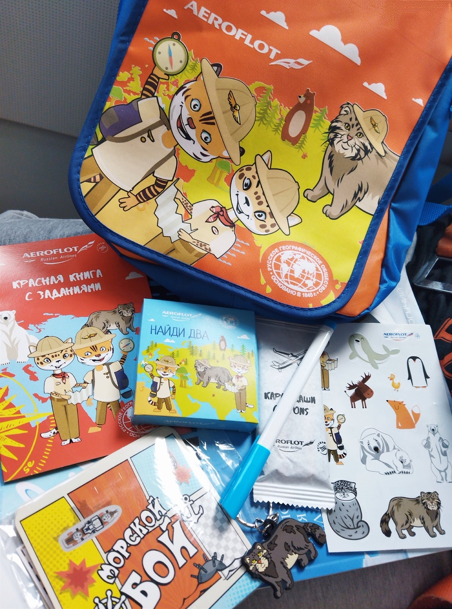 Итак, полмесяца нашего путешествия позади. Летим домой! Ну как домой - в Москву) Потом ещё последний рывок - поезд до Ярославля)) Дневной рейс Aeroflot SU-1483 по маршруту Красноярск-Москва SVO-B, в пути 5 часов. Детский набор в подарок: сумка с ремнём, настольные игры "Морской бой" и "Найди два", книжка с заданиями, набор наклеек, цветные карандаши, фирменная ручка, брелок с манулом. Питание: горячее на выбор (курица с рисом или говядина с лапшой), два кусочка ветчины с листьями салата, маринованный корнишончик с опятами, булочка с маслом и печенье-мюсли с клюквой и изюмом. Напитки: чай, кофе, соки (яблочный, апельсиновый, томатный), морс, красное и белое вино (Шато Тамань). Второй раз часа через полтора развозили просто воду с газом и без, чай чёрный/зелёный, кофе и вино. Перед посадкой в Шарике пилот объявил, что мы пролетели такие города, как: Нижневартовск, Ханты-Мансийск, Салехард, Сыктывкар, Вологда и... Ярославль. Эх, надо было выйти, - наша остановка 😁 Больше о Киргиз