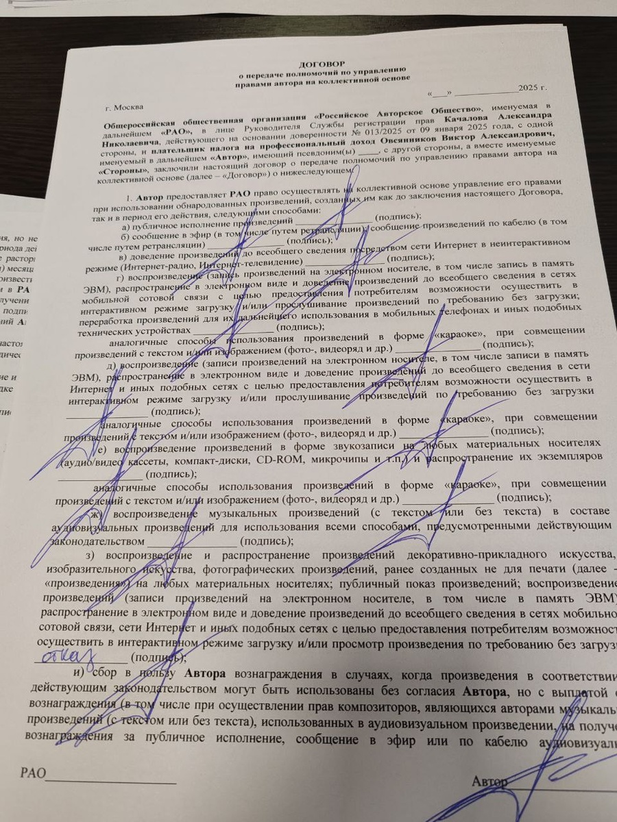 По двенадцать подписей-закорючек пришлось поставить на трех экземплярах договора, чтобы стать полноценным членом Российского авторского общества. Казалось бы мелочь, членство в РАО, но приятная и перспективная. Движение вперед никто не отменял. Благо есть, что предложить зрителю и слушателю. Но, об этом отдельно и позже. Всем добра и движения только вперёд!)