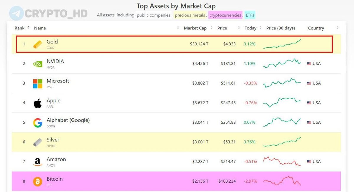 🔅 Золото стало первым активом в истории с рыночной капитализацией выше $30,000,000,000,000.