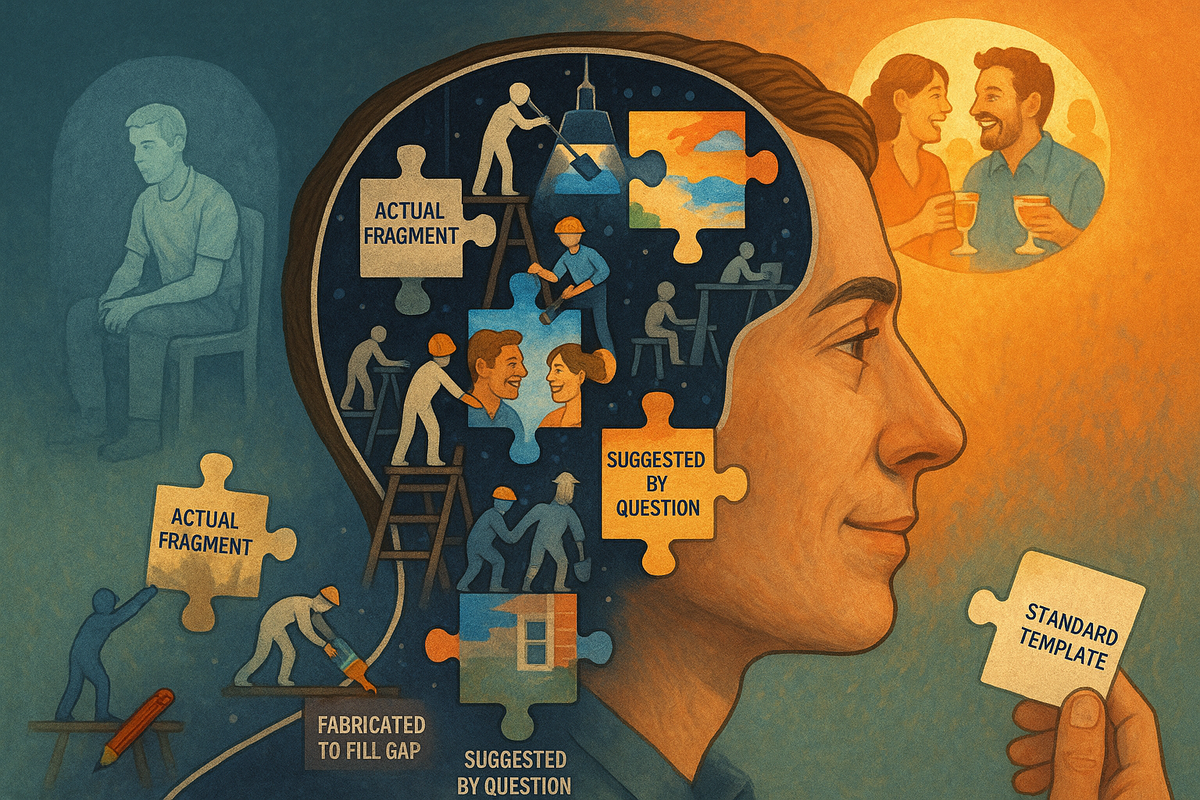 Когда нужно вспомнить — мозг не достаёт готовую запись. Он заново собирает историю из этих фрагментов. Достраивает недостающее. Сглаживает противоречия. Добавляет детали, которые «должны были быть». Подгоняет под общую логику.