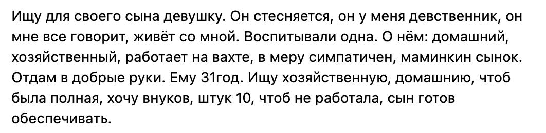 _________________________________________________________ Откуда берутся «сыночки-корзиночки»? Часть 2. В предыдущей статье я писала, как социальный аспект влияет на то, что мамам трудно отпускать от себя сыновей. А сейчас хочу поговорить про психологическую составляющую. Портрет женщины, у которых с большой вероятностью сыночка вырастет корзиночкой: 1️⃣ Она принимает «правила игры» патриархальной системы. Думает, что женщина без мужчины не справится/неполноценна. 2️⃣ Тревожна и не чувствует себя в безопасности. Из этого состояния она проявляет чрезмерную заботу, гиперопеку и контролирует сына, чтобы немного справиться со своей тревогой. 3️⃣ У неё нет мужа/партнёра, или он отсутствующий: трудоголик, работает вахтовым методом, имеет зависимость. Фактически мужчина есть, но нет с ним эмоциональной близости, поэтому получает её в отношениях с сыном. 4️⃣ Склонна занимать жертвенную позицию и манипулировать: я же ради тебя отказалась от всего, а ты вот так с матерью. 5️⃣ Не реализована в др