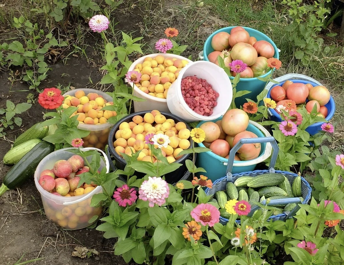 Свежие помидоры, огурцы, тыквы, груши и яблоки трех сортов, сливы, смородина, малина, зелень пучками. Картошка ведрами. Морковь, свекла, лук охапками.