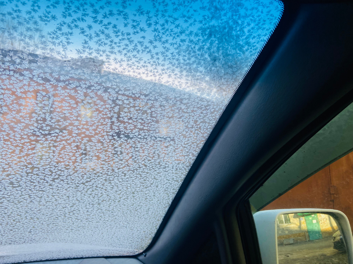 А на улице - мороз похозяйничал! За ночь расписал зимним узором лобовое стекло машины и рассыпал снежные кристаллы по зеленой траве.