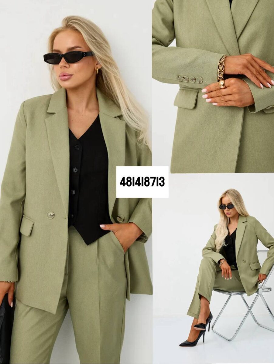 Костюм расслабленного кроя из плотной костюмной ткани благородного фисташкового тона. Пиджак с прямой линией плеч, аккуратными лацканами и одной застёжкой создаёт чистую вертикаль. Внутри — чёрный жилет на пуговицах, который формирует контраст и рисует линию талии. Брюки прямые, со стрелками и средней посадкой, длина прикрывает косточку — идеально для каблука-шпильки.