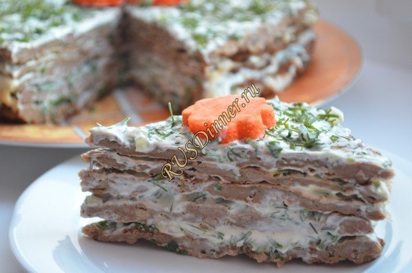 Печеночный торт Ингредиенты: Печень телячья - 800 гр. (или любая другая) Мука - 200 гр. Яйцо - 3 шт. Лук репчатый - 2 шт. Сметана - 350 мл. (или майонез) Масло растительное - 50 мл. Укроп - 1 пуч. Петрушка - 1 пуч. Соль - 5 гр. Перец черный молотый - 5 гр. Источник: https://rusdinner.ru/page/pechenochnyj-tort