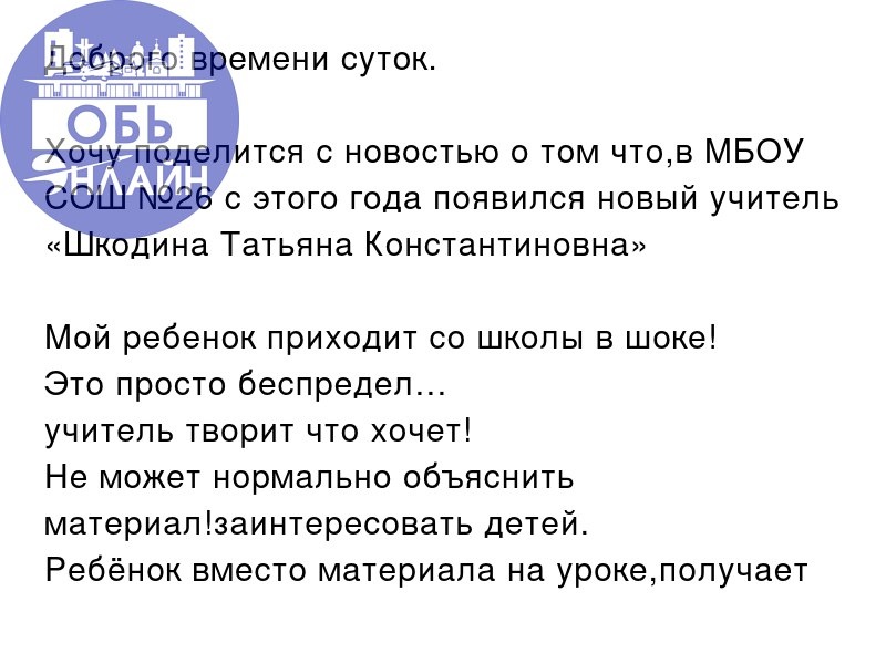 ↗ Доброго времени суток. Хочу поделится с новостью о том что,в МБОУ СОШ №26 с этого года появился новый учитель «Шкодина Татьяна Константиновна» Мой ребенок приходит со школы в шоке! Это просто беспредел… учитель творит что хочет! Не может нормально объяснить материал!заинтересовать детей. Ребёнок вместо материала на уроке,получает крики в свою сторону,потому что кто то в классе перешепнулся. Учитель вечно кричит о том что дети сидят в телефоне,делая вид что он знает как вычислить такого самого «беспредельщика» при это ребёнок просто смотрел в свою тетрадь.. Я конечно всё понимаю,но не это!!! Кто давал права кричать на детей !!? В итоге учитель решил,собирать телефоны и что из этого вышло!? Закончив свою работу, ребенок взяв СЫОЙ телефон слышит: «положил на место! Я не давала права его брать!!(телефон)» А кто вы такая чтоб давать право!!на то чтоб ребёнок мог забрать СВОЮ вещь!! Вроде учитель обществознания и не знает элементарного!! Статья 209…