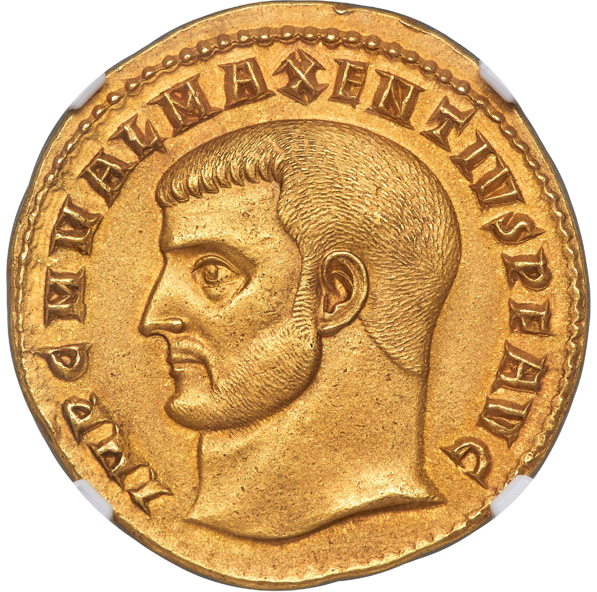 Этот памятник Константин не уничтожил, а просто обезличил, стерев имя Максенция. Наконец, будучи конституционно изолированным от правителей в других местах, но со смертью, которая в своё время унесла жизни нескольких правителей, Максенций совершенно бесстыдно ссылался на свои прежние семейные связи с покойными, даже в отношении тех, с кем его фактические отношения были враждебными. Таким образом, он создал всё более широкий спектр монет consecratio, в которых, помимо своего юного сына Ромула, который был обожествлён с 309 года, он также поместил Констанция в качестве своего adfinis или cognatus, добавив с 310 года своего отца (как старшего или pater), затем Галерия (как socer) с 311 года. Только Север был проигнорирован. Действительно, отсутствие в этом ряду Диоклетиана, которого Максенций, несомненно, почтил бы подобным образом, как и других, подтверждает предположение о том, что его смерть наступила после смерти Максенция, возможно, в декабре 312 года, но, безусловно, до лета 313 года. В конце концов, конечно, именно другому сыну тетрарха, Константину, чьи отношения с тетрархической системой были менее напряженными, но все еще неровными, удалось вторгнуться в Италию и уничтожить Максенция. Хотя войска последнего столкнулись с Константином в северной Италии, сам Максенций не вышел в поход, укрепив свой образ невоинственного императора и командующего парадами, и остался в Риме, надеясь почти по инерции отразить это третье серьезное испытание в Италии, как и два предыдущих. Но 312 год – это не 307 год. Все преимущества, которые он имел перед Севером и Галерием, оказались бесполезны против Константина, и его репутация в городе была серьёзно подорвана.