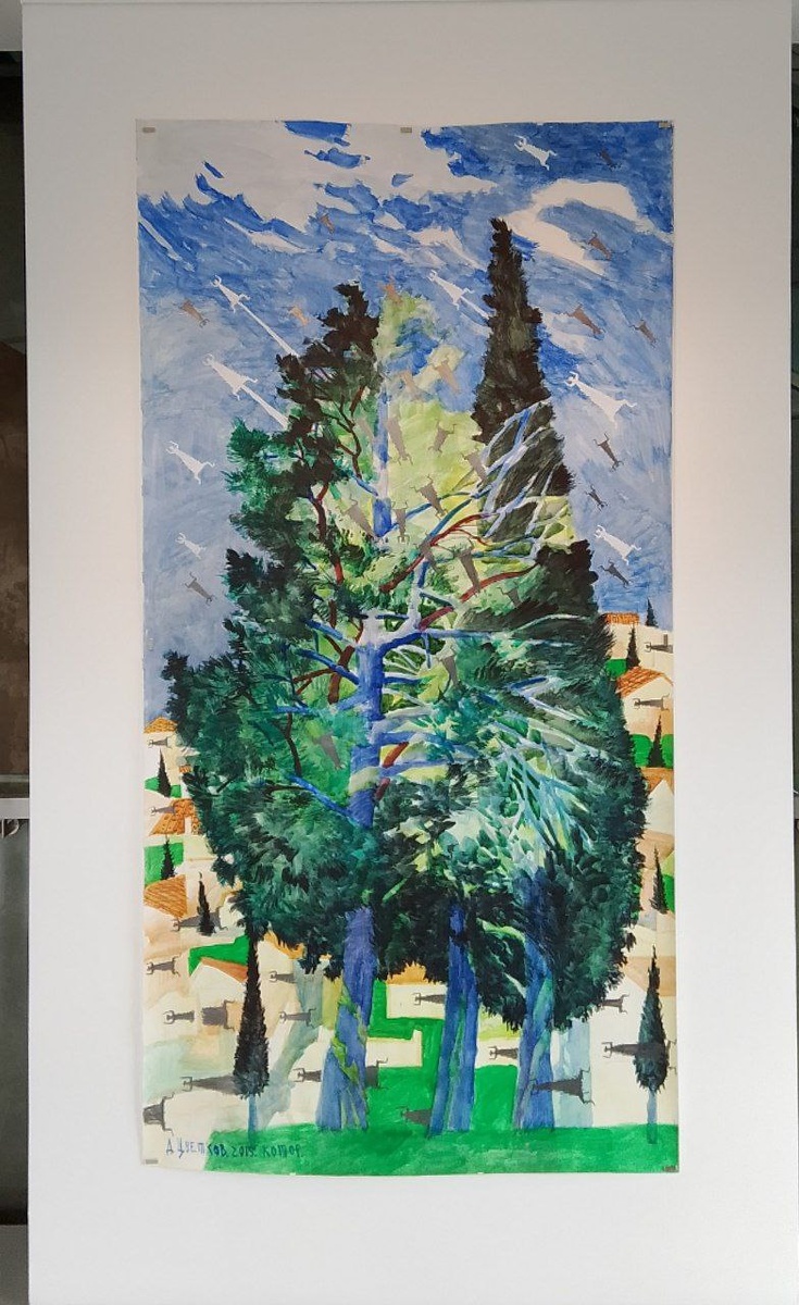 3.Дмитрий Цветков. Выставка "Жизнь" в галерее RuArts в 1-м Зачатьевском переулке. Которские горные виды. Речь идёт о Черногории, той которая Монтенегро. Горы, солнце, пальмы. К ним, как и во многих других своих работах художник добавляет множество тараканоподобных человечков. Они ещё за собой некий след оставляют. Понятных объяснений этому символу я не нашел, но могу предположить, что таким образом выражается отношение к "человеку", как элементу природы и его месте в художественном восприятии сущего мира с точки зрения творца. Человеко-таракан, оставляющий за собой след. Ох уж, эти авангардисты..., символисты, нонконформисты. Помню был на выставке в музее нонконформизма, там тоже что-то подобное было. Да и Игорь Новиков в этом смысле не отстаёт.