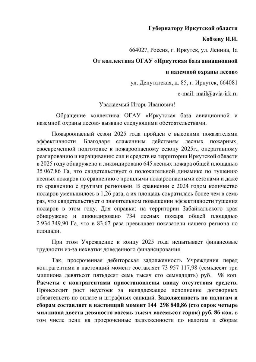 Лесные пожарные заявили о массовых увольнениях в Иркутской области Сотрудники госучреждения «Иркутская база авиационной и наземной охраны лесов» заявили об отсутствии финансирования. Обращение работников к губернатору Игорю Кобзеву («Единая Россия») опубликовал журналист Павел Степанов в своём телеграм-канале. «В ноябре-декабре текущего года существует риск, что работники учреждения получат лишь гарантированную часть заработной платы без стимулирующих и компенсационных выплат, что является недопустимым нарушением трудового законодательства и прав работников, — сказано в письме. — При этом необходимо отметить, что работники учреждения вообще не получают премиальные выплаты. <…> Рассматривается вопрос о переходе на неполное рабочее время с пропорциональным уменьшением оплаты труда». Для «экономии фонда оплаты труда» планируется сократить порядка 500 лесных пожарных, утверждают авторы обращения. Кроме того, госучреждение задолжало по налогам 144 млн рублей, ещё 73 млн должны подрядчик