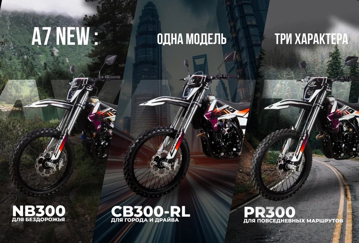 — Avantis A7 NEW NB300 : мощный (29 л.с.) мотоцикл с жидкостным охлаждением и балансирным валом. Чистокровный внедорожник: любит грязь, уклоны и длинные эндуро-маршруты.