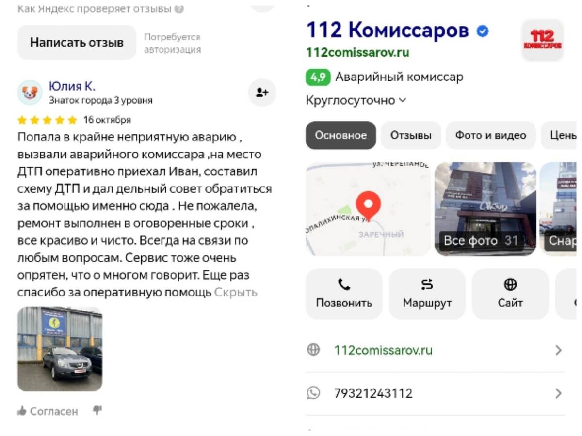 Даже самая неприятная ситуация на дороге может закончиться спокойно и без нервов, если рядом профессионалы. Наша клиентка поделилась своим отзывом после того, как обратилась в компанию «112 Комиссаров»: «Попала в крайне неприятную аварию, вызвали аварийного комиссара, на место ДТП оперативно приехал Иван, составил схему ДТП и дал дельный совет обратиться за помощью именно сюда. Не пожалела, ремонт выполнен в оговоренные сроки, все красиво и чисто. Всегда на связи по любым вопросам. Сервис тоже очень опрятен, что о многом говорит. Еще раз спасибо за оперативную помощь.» Наши аварийные комиссары приезжают на место быстро, помогают оформить все документы, сопровождают клиента до конца ремонта и следят, чтобы результат был идеальным.