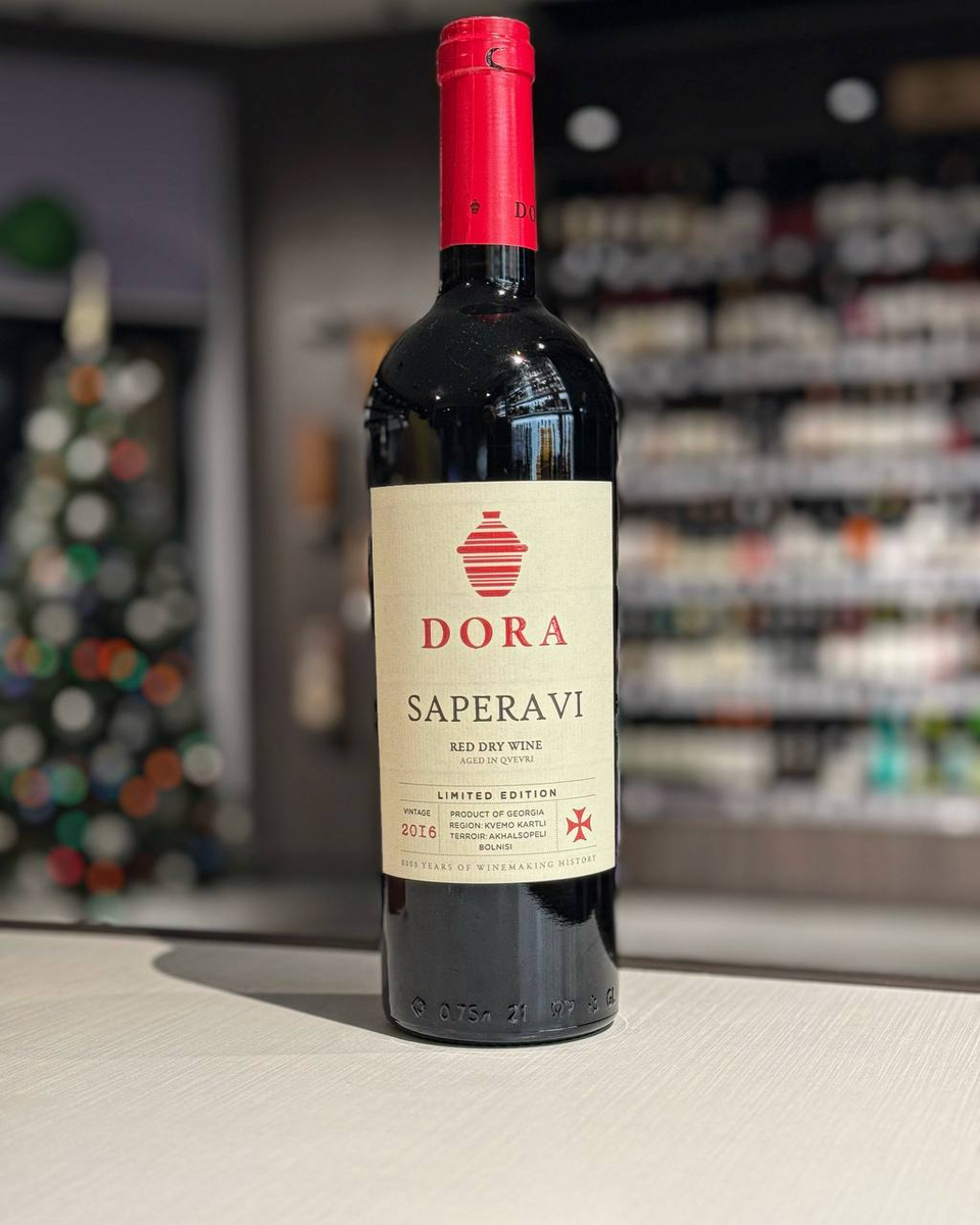 Грузинское красное сухое вино "Dora" производится из винограда сорта Саперави, выращенного в регионе Квемо Картли.