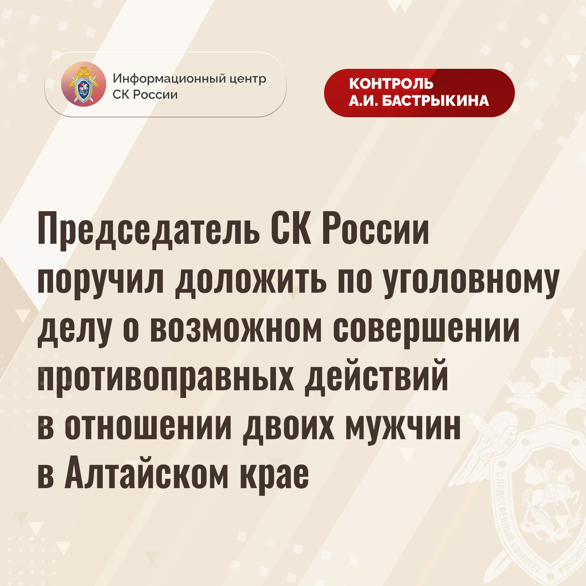 #СледственныйКомитет #СКРоссии #СКР #ИЦСКР #ИнформационныйЦентр #АлександрБастрыкин #ПредседательСКР #КонтрольПредседателяСКР #КомментарийКонтроль #АлтайскийКрай