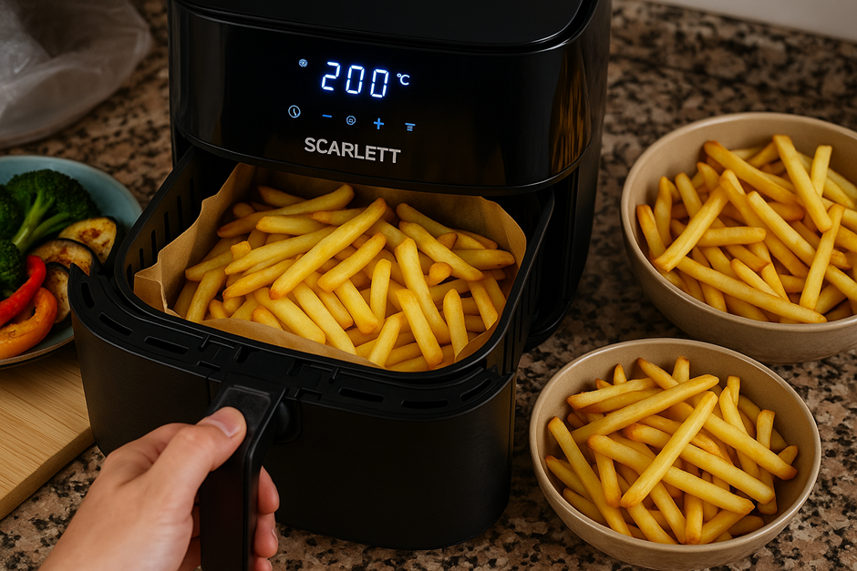 Приготовление картошки в аэрогриле — это отличный способ получить хрустящий, золотистый и ароматный гарнир без лишнего масла и жира. Этот способ жарки позволяет сохранить максимум вкуса и питательных веществ, а также экономит время по сравнению с духовкой или фритюрницей. Благодаря равномерному нагреву и циркуляции горячего воздуха этот популярный овощ получается аппетитным снаружи и мягким внутри, а разнообразие способов приготовления позволяет экспериментировать с ароматами, специями и текстурой. Рекомендуем модель SCARLETT SC-AF15S01D — она подходит и для гарниров, и для выпечки. Это устройство компактного размера, мощностью 1200 Вт. Объем чаши составляет 4,2 литра. Техника с сенсорным управлением и с 7 предустановленными программами, среди которых есть и картошка фри. Разберемся, как приготовить картошку в аэрогриле: подготовили семь интересных вариантов, подходящих как для повседневного ужина, так и для праздничного стола. Для приготовления в аэрогриле выбираем свежие, плотные кар