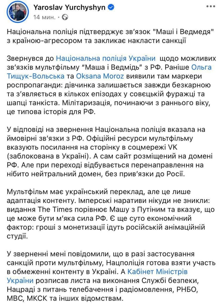 Нацполиция Украины подтвердила связь популярного мультфильма «Маша и Медведь» с Россией и призывает ввести против него санкции. Об этом заявил председатель комитета Верховной Рады по свободе слова Ярослав Юрчишин. По его словам, после анализа содержания мультфильма, в Нацполиции пришли к выводу, что он содержит «традиционные пропагандистские, имперские нарративы», в том числе, способствует ранней милитаризации детей. Депутат также отметил, что, несмотря на наличие украинского перевода, средства, полученные от монетизации просмотров «Маши и Медведя», направляются в российскую анимационную студию. Ранее мы писали, что в Раде предложили запретить «Машу и Медведя» из-за самовара и балалайки.