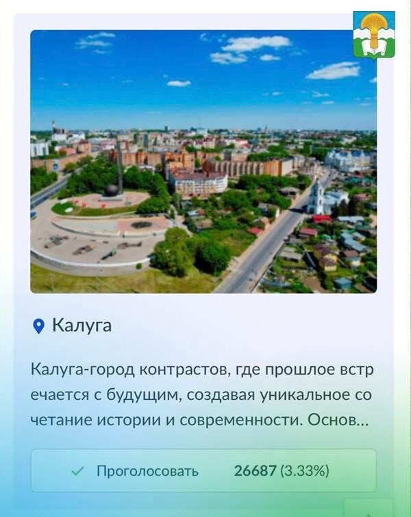 Наш город вышел в финал конкурса. Уже более 26 тысяч человек поддержали Калугу, и вы тоже можете отдать свой голос через Госуслуги по этой ссылке 👉🏼https://clck.ru/3LSxi8 👈🏼