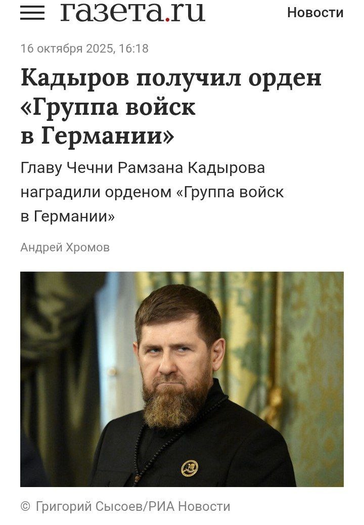 Его наградили орденом «Группа войск в Германии», который вручают ВОВ, тем, кто выбивал немецкие войска и принимал участие в создании ГДР, либо же служил там. Награду Кадырову вручили представители председателя местного «Союза ветеранов Группы советских войск в Германии». Советская группа войск дислоцировалась в Германии с 1945 по 1994 годы. Кадырову же на тот момент было 14 лет, в боях он не участвовал, но медаль за это все равно получил. Видимо в России уже начали заканчиваться медали, которых еще нет у Кадырова