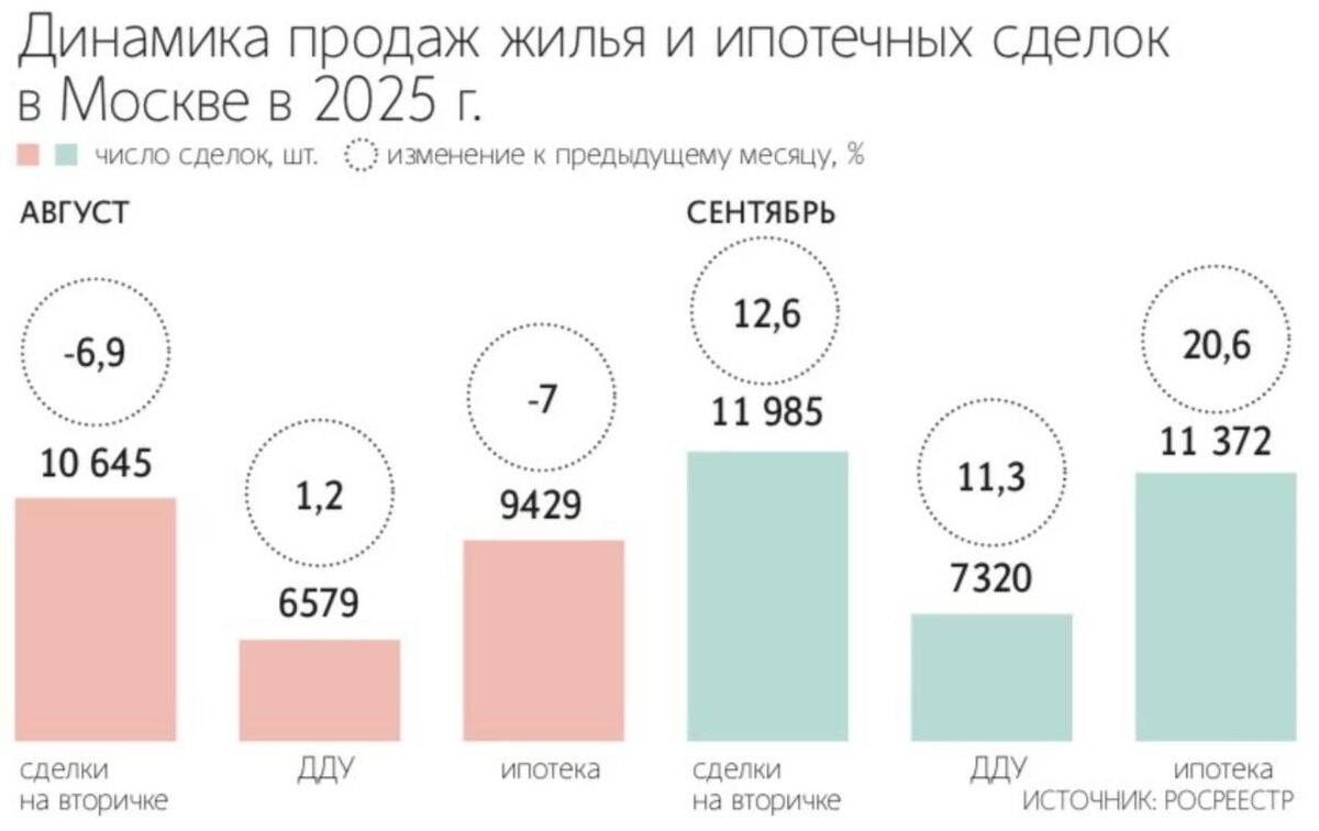 В сентябре в столице зарегистрировано 11 985 сделок на вторичном рынке (+12,6% за месяц) и 7 320 в новостройках (+11,3%). В годовом выражении рост составил 5,2% и 15%.