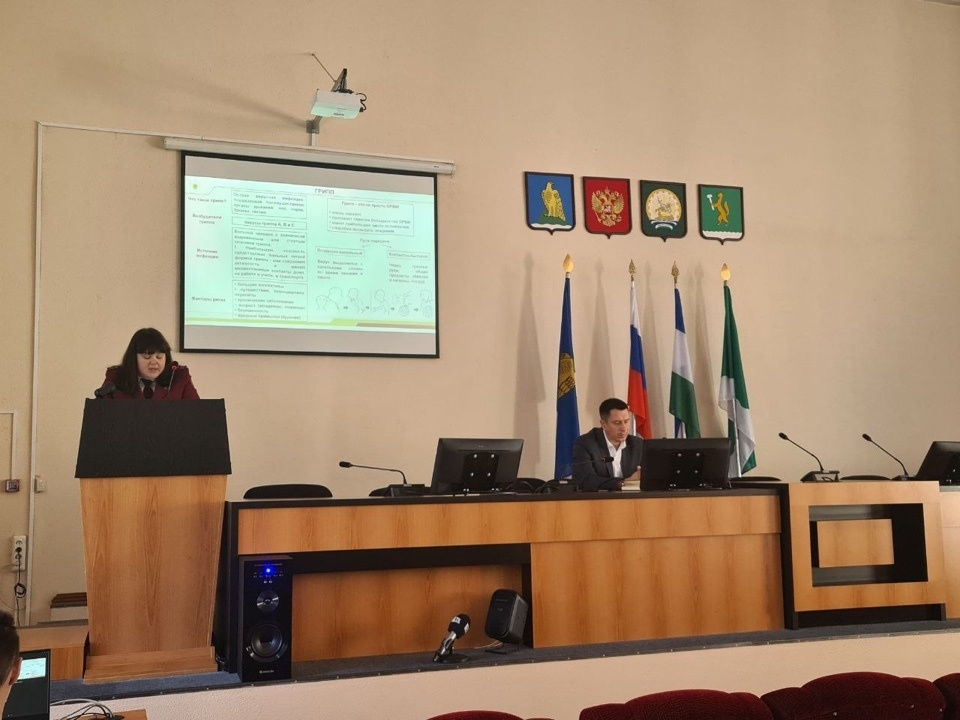 В администрации состоялось совещание по вопросам профилактики распространения вируса гриппа в период сезонных заболеваний. Начальник территориального отдела Роспотребнадзора по Республике Башкортостан в Белорецком, Абзелиловском, Бурзянском, Учалинском районах Юлия Берзина рассказала о методах профилактики острых респираторных вирусных инфекций. - Грипп – это острая вирусная инфекция, поражающая преимущественно органы дыхания: нос, горло, бронхи, лёгкие. Источником инфекции является больной человек с клинически выраженным или стёртым течением гриппа.Наибольшую опасность представляют больные лёгкой формой гриппа - они сохраняют активность и имеют множественные контакты как дома, так и на работе, в учебных заведениях, в транспорте.Грипп - это не просто ОРВИ. Он гораздо заразнее, протекает тяжелее большинства инфекций, чреват осложнениями и способен вызывать эпидемии, - особо подчеркнула Юлия Германовна. - Передается воздушно-капельным путем, выделяется с капельками слюны во время чихания и кашля, а также контактно-бытовым путём: через грязные руки, общие предметы обихода и гигиены, посуду.Грипп начинается остро: резко повышается температура до 38-40°C, больной страдает от сильной головной боли и слабости, ломоты в мышцах и суставах, появляется насморк, кашель и першение в горле. Самолечение в таком случае не просто малоэффективно, но и опасно! Ведь грипп убивает своими осложнениями лёгкие, верхние дыхательные пути, сердечно-сосудистую, нервную системы.