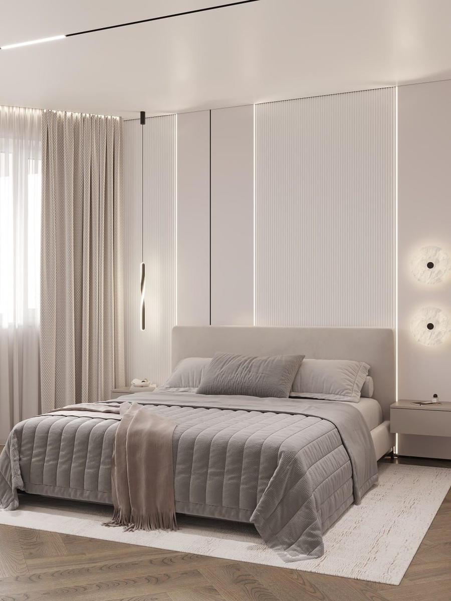 Каждая деталь — от фактуры текстиля до подсветки — продумана, чтобы пространство выглядело легко и гармонично.