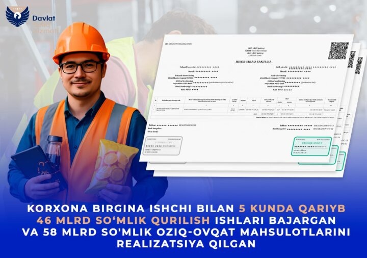 По информации Налогового комитета, общество с ограниченной ответственностью "Gold" (название изменено), зарегистрированное для осуществления оптовой деятельности с уставным фондом 1 млн сумов, за период с 8 по 13 октября 2025 года оформило электронные счета-фактуры на выполнение строительно-монтажных работ на 46 млрд сумов и реализацию продовольственной продукции на 58 млрд сумов.