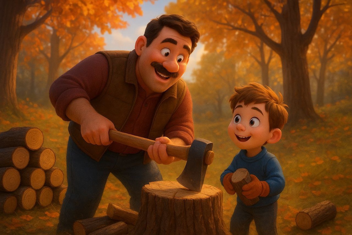 Сказка «Тёплое сердце и зимние дрова» Осень уже набирала силу. Утром воздух был свежий и прозрачный, по лужам бегал тонкий ледок, а солнце, будто застенчивое, всё чаще пряталось за тучи. В этот день папа Ваня сказал своему сыну Мише: — Ну что, помощник, пора нам готовить дрова. Зима не за горами! Миша подпрыгнул от радости. Ему было всего восемь лет, но он гордился тем, что может помогать папе. Ведь дом у них — большой, с резными ставнями и камином, где зимой всегда потрескивали поленья, наполняя комнату ароматом леса. Папа Ваня достал топор, проверил его остроту и протянул Мише маленькие перчатки. — Без дела не стой, — улыбнулся он. — Пойдем в лес за поленьями, покажу тебе, как отличить сухое дерево от живого. Дорога в лес лежала через поля, где уже скошена трава, а вдалеке паслись вороны. Ветер шептал в кронах: «Готовьтесь, люди, к зиме…» Миша слушал этот шёпот и представлял, как скоро они будут сидеть у камина, пить чай с мёдом, а за окном будет метель. В лесу пахло смолой и сы