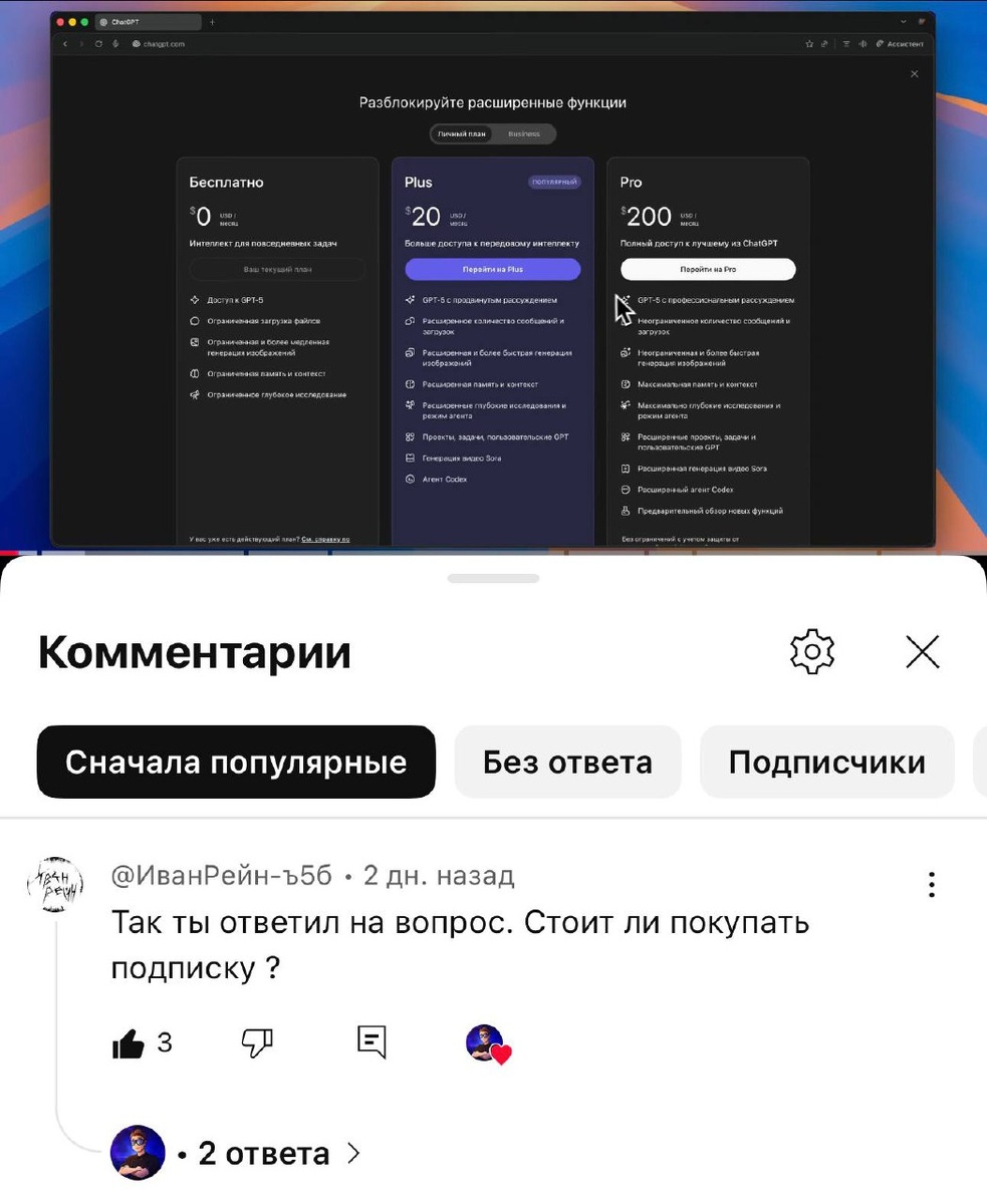 π€Π‘ΡΠ΄Ρ ΠΏΠΎ ΠΊΠΎΠΌΠΌΠ΅Π½ΡΠ°ΡΠΈΡΠΌ ΠΏΠΎΠ΄ ΠΏΠΎΡΠ»Π΅Π΄Π½ΠΈΠΌ ΠΌΠΎΠΈΠΌ Π²ΠΈΠ΄Π΅ΠΎ, ΠΌΠ½ΠΎΠ³ΠΈΠ΅ ΠΏΠΎΡΡΠΈΡΠ°Π»ΠΈ, ΡΡΠΎ Ρ ΡΠ°ΠΊ ΠΈ Π½Π΅ ΠΎΡΠ²Π΅ΡΠΈΠ» ΠΎΠ΄Π½ΠΎΠ·Π½Π°ΡΠ½ΠΎ Π½Π° Π²ΠΎΠΏΡΠΎΡ Π²ΠΈΠ΄Π΅ΠΎ - Π° ΡΡΠΎΠΈΡ Π»ΠΈ ΠΏΡΠΈΠΎΠ±ΡΠ΅ΡΠ°ΡΡ ΠΏΠΎΠ΄ΠΏΠΈΡΠΊΡ Π½Π° chatGPT? ΠΠ΄Π΅Ρ Π±ΡΠ»Π° Π² ΡΠΎΠΌ, ΡΡΠΎ Π±Ρ ΠΏΠΎΠΊΠ°Π·Π°ΡΡ ΡΡΠΎ Π²Ρ ΠΏΠΎΠ»ΡΡΠ°Π΅ΡΠ΅ Π·Π° ΠΏΠΎΡΡΠ°ΡΠ΅Π½Π½ΡΠ΅ Π΄Π΅Π½ΡΠ³ΠΈ, Π° Π²ΡΠ΅ Π²ΡΠ²ΠΎΠ΄Ρ Π·ΡΠΈΡΠ΅Π»Ρ ΡΠΆΠ΅ Π΄Π΅Π»Π°Π΅Ρ ΡΠ°ΠΌΠΎΡΡΠΎΡΡΠ΅Π»ΡΠ½ΠΎ ΠΈΡΡ