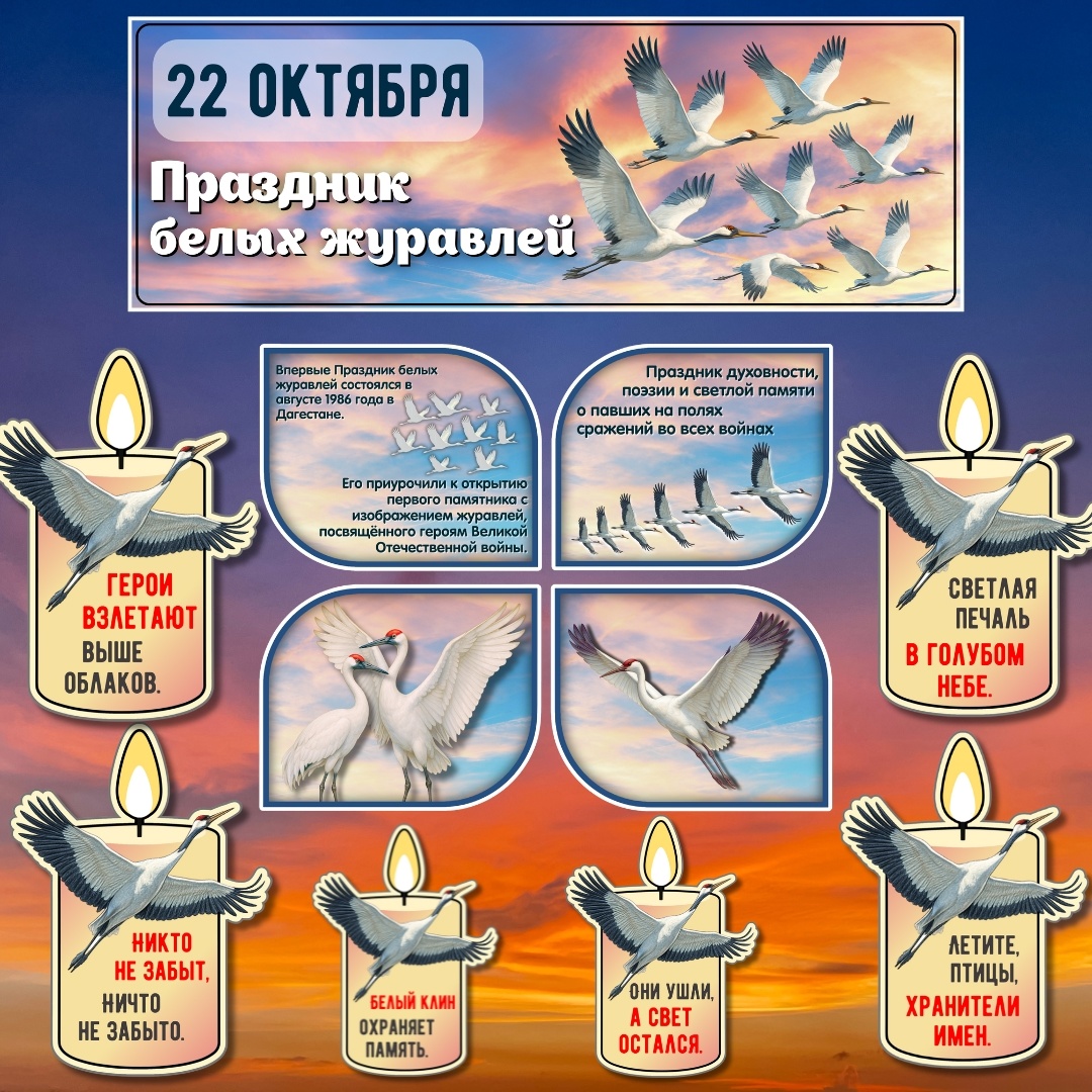 Оформление ко Дню белых журавлей (22 октября). Готовый комплект для проведения классного часа, урока памяти или патриотического мероприятия, посвящённого Дню белых журавлей — дню памяти павших воинов. Баннер – 4 листа А4 (сборный формат для доски или стенда); Плакаты – изображения журавлей и исторические факты; Стикеры-свечи – 6 листов А4. Тематика и содержание: История праздника (основан в Дагестане в 1986 году); Символ журавлей как образ памяти о павших героях; Развитие духовности, патриотизма, чувства сопричастности и уважения к истории. Кому подойдёт: Классным руководителям. Учителям истории, литературы, обществознания. Педагогам-организаторам для проведения памятных мероприятий. Школьным библиотекарям для оформления выставок и стендов.