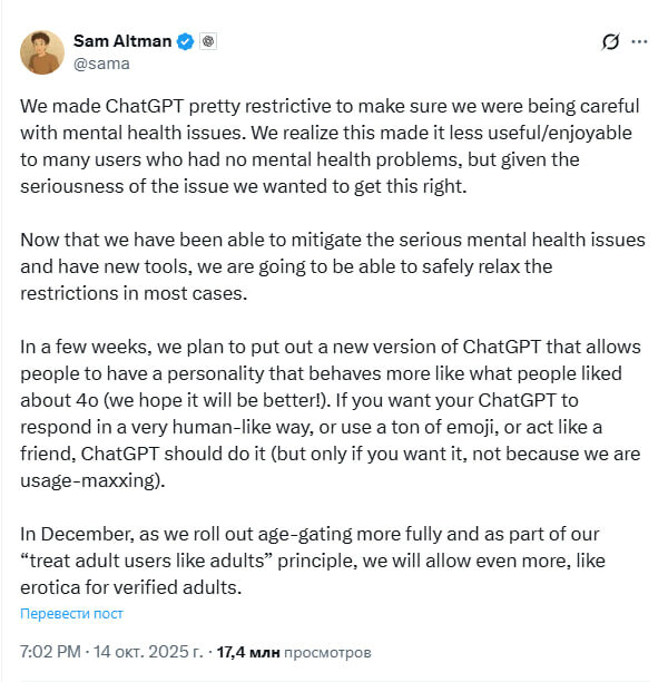 🔸Сэм Альтман проанонсировал эротику в ChatGPT: В декабре, по мере более полного внедрения возрастного ценза и в рамках нашего принципа «относитесь к взрослым пользователям как к взрослым», мы разрешим ещё больше, например, эротику для подтверждённых взрослых.