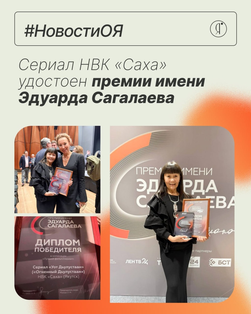 Национальная вещательная компания «Саха» продолжает покорять всероссийские конкурсы. Вчера, 16 октября, в Московском международном доме музыки сериал «Уот Дьулустаан» был удостоен премии имени Эдуарда Сагалаева в номинации «Фильм/Сериал».