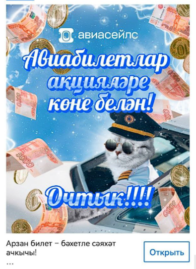 В своих кампаниях бренд не раз использовал региональные языки, в том числе и татарский. Например, вот виджет с милым котиком и подписью на татарском языке.