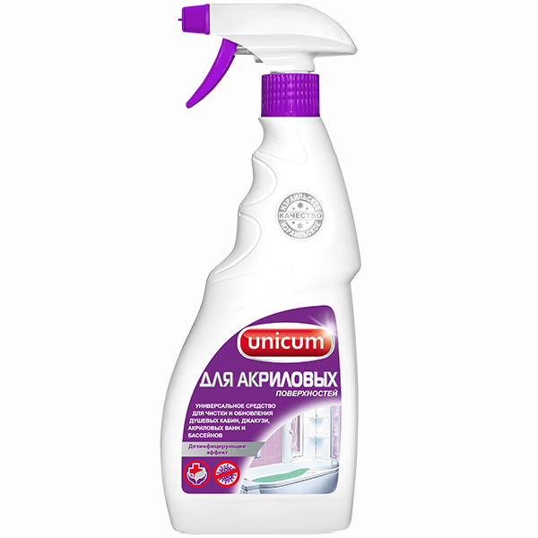 Акрил отличается гладкой и пористой структурой. Он легче и теплее чугуна, но чувствителен к химии и механике. Обычные чистящие средства могут повредить покрытие. Хлор, кислоты, абразивы вызывают микротрещины, потемнение и потерю блеска. При регулярной обработке неподходящими составами материал тускнеет, становится шероховатым. Поверхность быстрее загрязняется и сложнее отмывается. Некачественная чистка снижает срок службы ванны. Мелкие повреждения накапливаются, превращаясь в глубокие дефекты. Поэтому важно выбирать специализированную химию. Подходящие средства очищают бережно, не разрушая структуру. Жидкое средство Unicum подходит для ухода за акриловыми ваннами и душевыми кабинами. Оно эффективно очищает поверхность от мыльного налета, известковых отложений, ржавчины и плесени. Состав включает: Флакон объемом 500 мл оснащен распылителем. Отдушки нет, текстура — жидкая. Средство можно наносить на акрил, эмаль, фарфор, плитку, пластик и металл. Оно подходит для ванн, кабин, джакузи и д