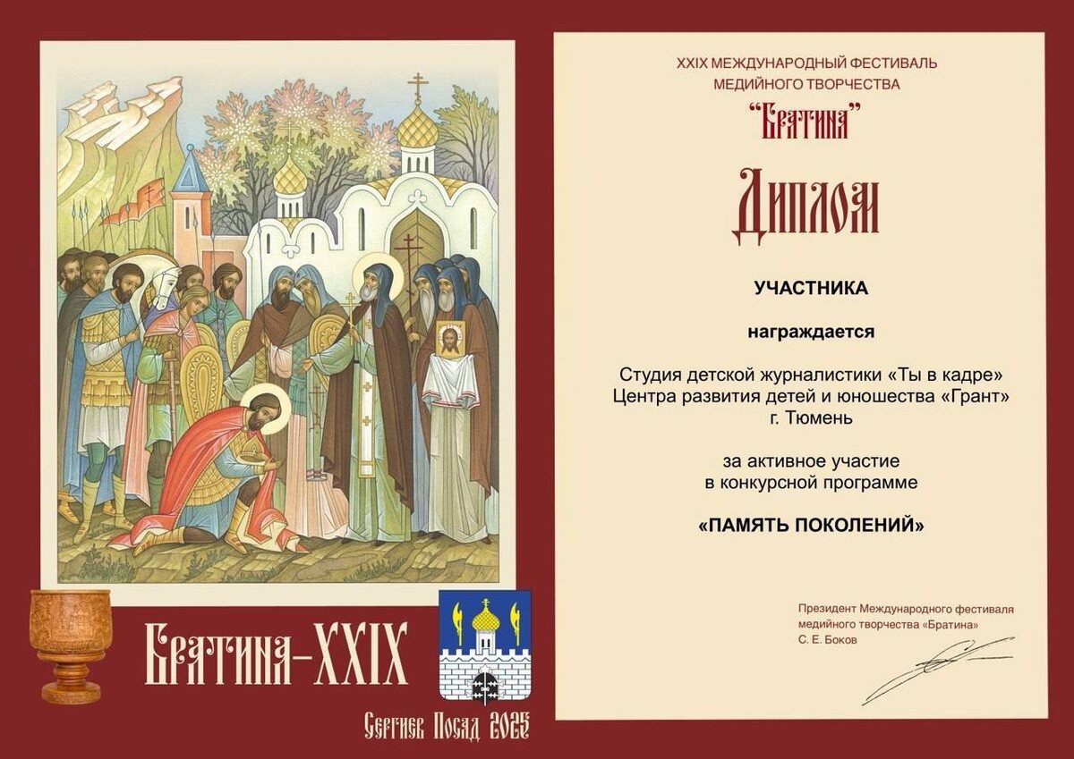 В кадре на международном уровне Студию детской журналистики «ТЫ В КАДРЕ!» отметили на международном фестивале медийного творчества для профессиональных журналистов «Братина». Это крупнейшее медиасобытие в городе Сергиев Посад собрало более 100 участников из 25 регионов России, а также зарубежных стран — Китая, Беларуси и Сербии. В номинацию «Связь поколений» ребята отправили две работы. Одна из них репортаж про выставку памяти тюменского фотографа Михаила Калянова «Жизнь Zа СВОих». Михаил - единственный профессиональный фотокор Тюменской области, который на протяжении полугода в начале СВО работал в Донбассе. Второй конкурсный репортаж про Всероссийскую акцию от Росгосцирка «Портрет циркового героя». Это ролик о выставке рисунков в Тюменском цирке: ученики художественных школ города рисовали жонглёров, акробатов и клоунов - участников Великой Отечественной войны, а юнкоры сняли об этом сюжет. Поздравляем ребят и желаем новых творческих успехов!