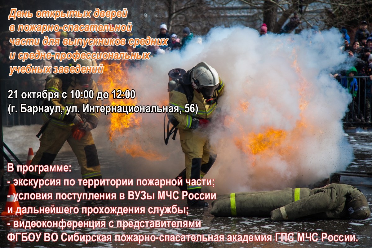 🔔21 октября с 10:00 до 12:00 ГУ МЧС России по Алтайскому краю приглашает выпускников средних и средне-профессиональных учебных заведений на «День открытых дверей». 🔥Мероприятие состоится на территории 1 пожарно-спасательной части 1 пожарно-спасательного отряда. ‼Будущим абитуриентам расскажут об условиях поступления в ВУЗы МЧС России, о правилах и порядке приема документов, об условиях прохождения службы, о льготах и социальных гарантиях. Будет проведена экскурсия по территории части с демонстрацией боевой одежды и техники. На вопросы ответят выпускники, окончившие ведомственные учебные заведения, а по видеоконференцсвязи проконсультируют представители приемной комиссии Сибирской пожарно-спасательной академии ГПС МЧС России. Будет интересно! МЧС Алтайского края Подписывайся на МЧС России в Telegram | MAX