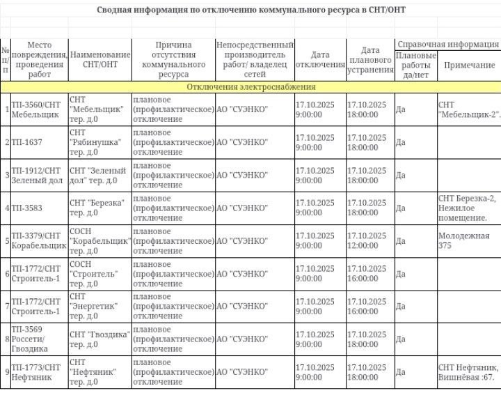 Информация по плановым отключениям в СНТ/ДНТ на 17.10.2025 от ЕДДС города Тюмени